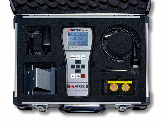Высокоустойчивая, водонепроницаемая, портативная коробка из алюминиевого сплава; внутри есть прибор, зонды, кабель связи, руководство по эксплуатации, блоки проводимости, зарядка,приборная стойка, Проводящие блоки, зарядное устройство, приборная стойка,проводящие блоки, зарядное устройство, приборная стойка, U-диск |